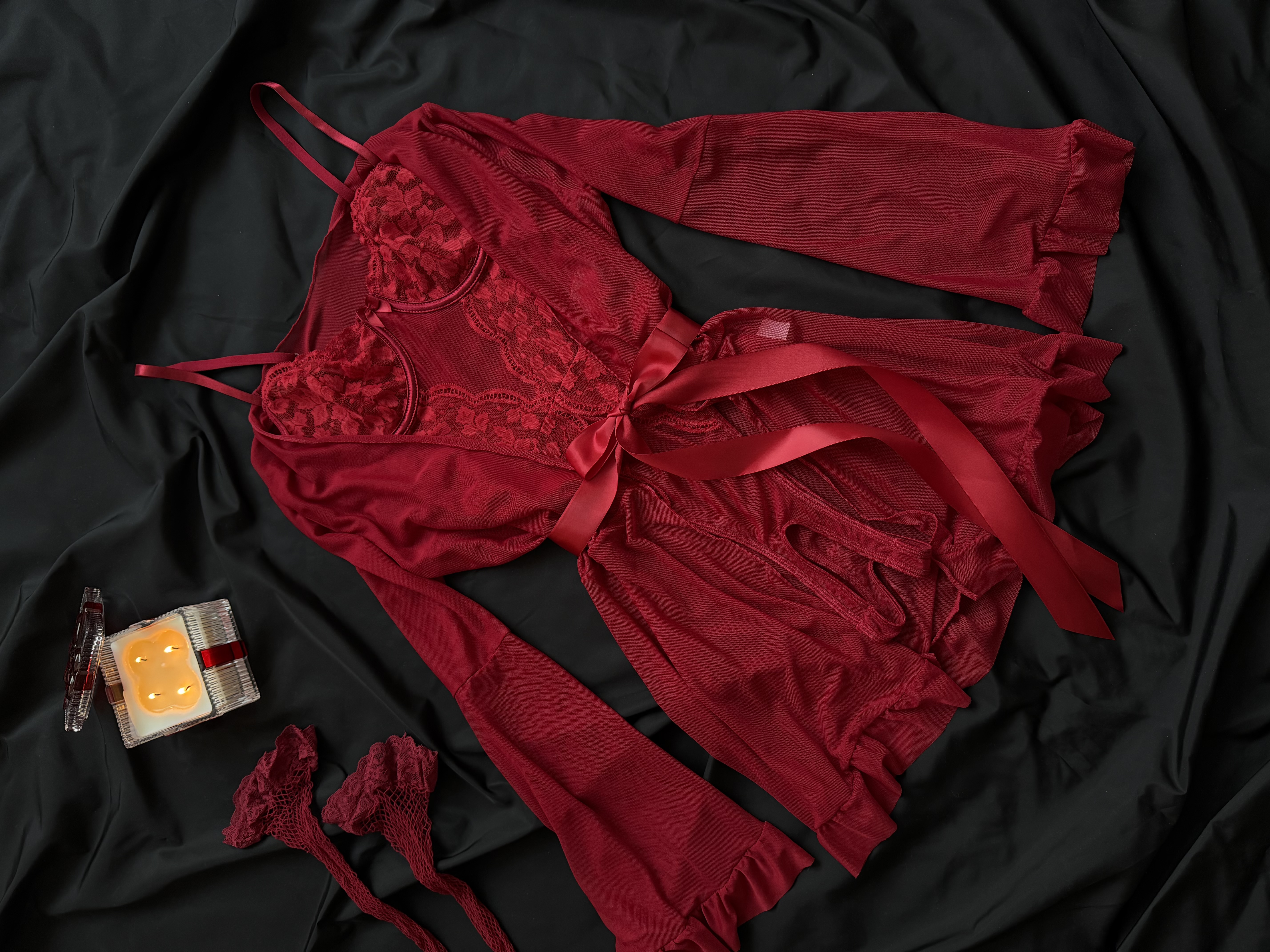 Вишукана та пристрасна комбінація - боді з відкритим доступом, напівпрозорий халатик і завершують образ панчохи в сіточку 🍷❤️🔥