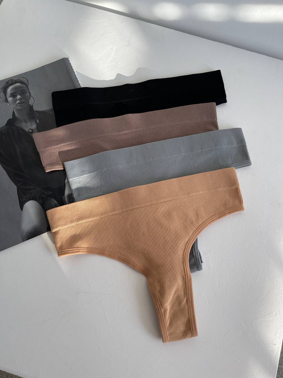 Зручні, базові трусики стрінги в базових кольорах, мають високу посадку, тканина у рубчик.